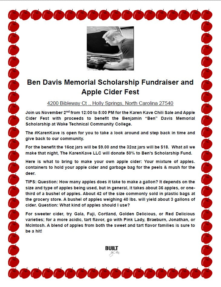 Upcoming Events to Benefit the Ben Davis Memorial Scholarship at Wake Technical Community College